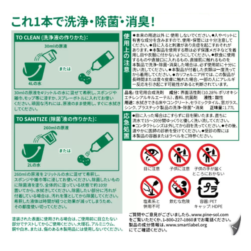 その他の項目 | 掃除全般:使用量の目安として、水4リットルあたり約30ミリリットルの原液を加えて使用してください。 頑固な汚れ:原液を使用し、すぐに水拭きしてください。塗装された表面に使用される場合は、ご使用前に目立たない箇所で試してから使用してください。 銅や白木、または傷のある木製用品には使用しないでください。 用途:水拭きできる床やコンクリート、セラミックタイル、窓ガラス、シンク、プラスチック製品の洗浄・除菌 *すべての菌を除菌できるわけではありません。 |