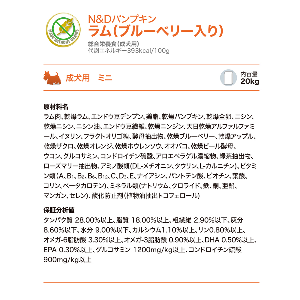 ファルミナ N&Dパンプキン ラム(ブルーベリー入り)成犬用 ミニ 20kg