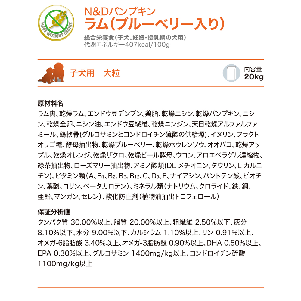 ファルミナ N&Dパンプキン ラム(ブルーベリー入り)子犬用 大粒 20kg