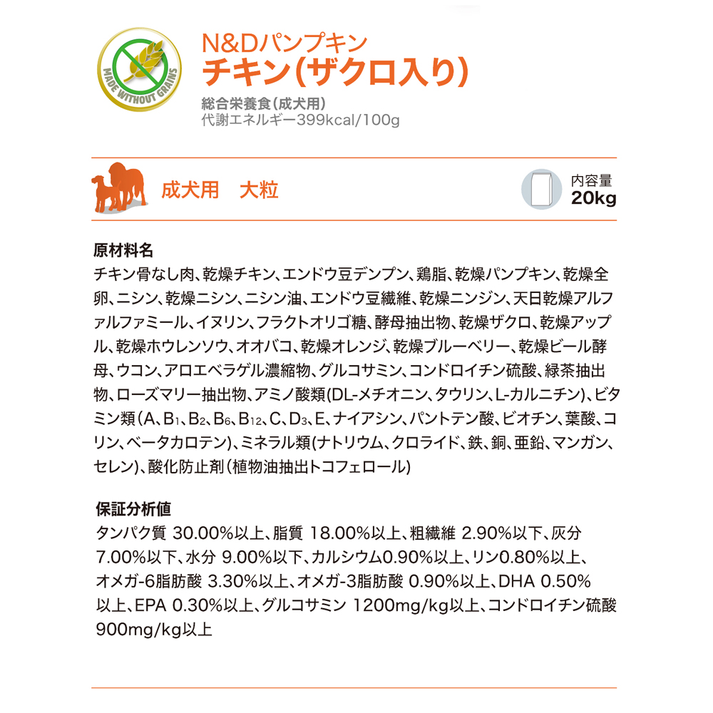 ファルミナ N&Dパンプキン チキン(ザクロ入り)成犬用 大粒 20kg