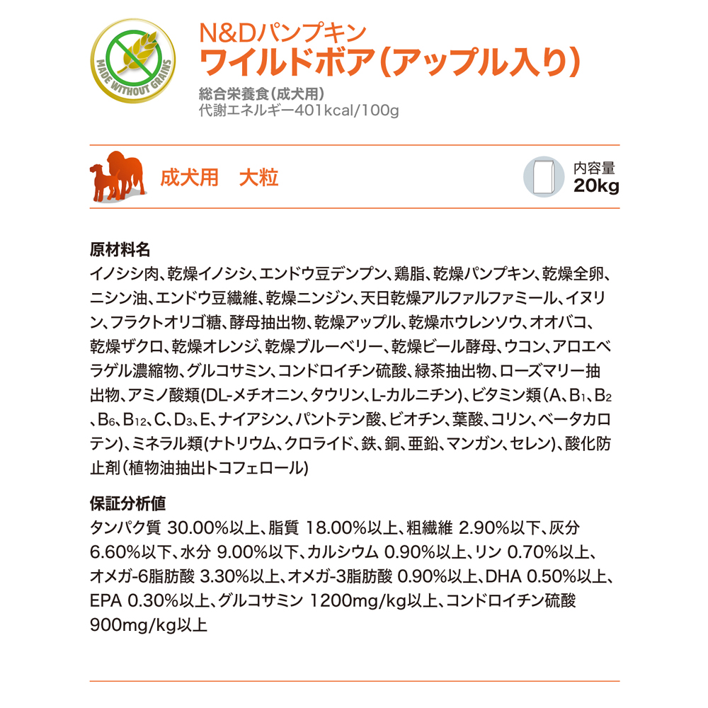 ファルミナ N&Dパンプキン ワイルドボア(アップル入り)成犬用 大粒 20kg
