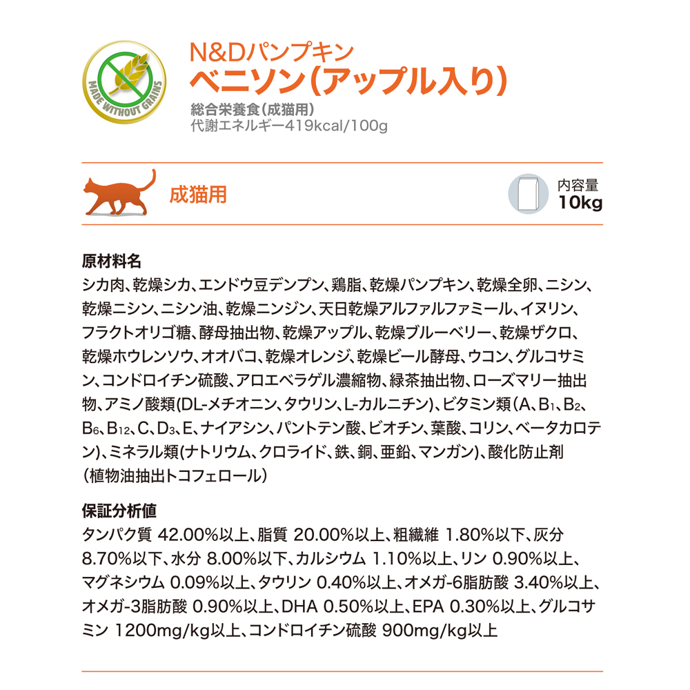 ファルミナ N&D パンプキン ベニソン アップル入り 成猫用 10kg